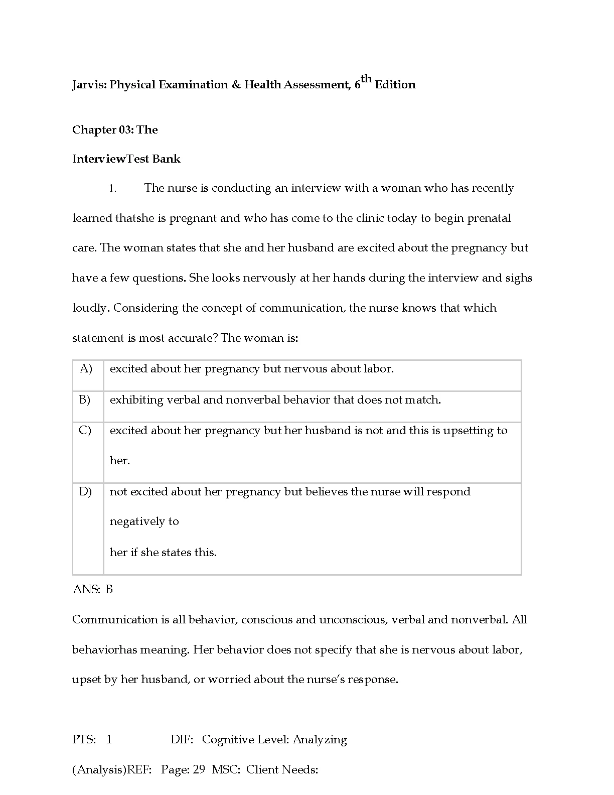 Test Bank For Physical Examination & Health Assessment, 6th Edition BY Jarvis (Chapter 03: The Interview)