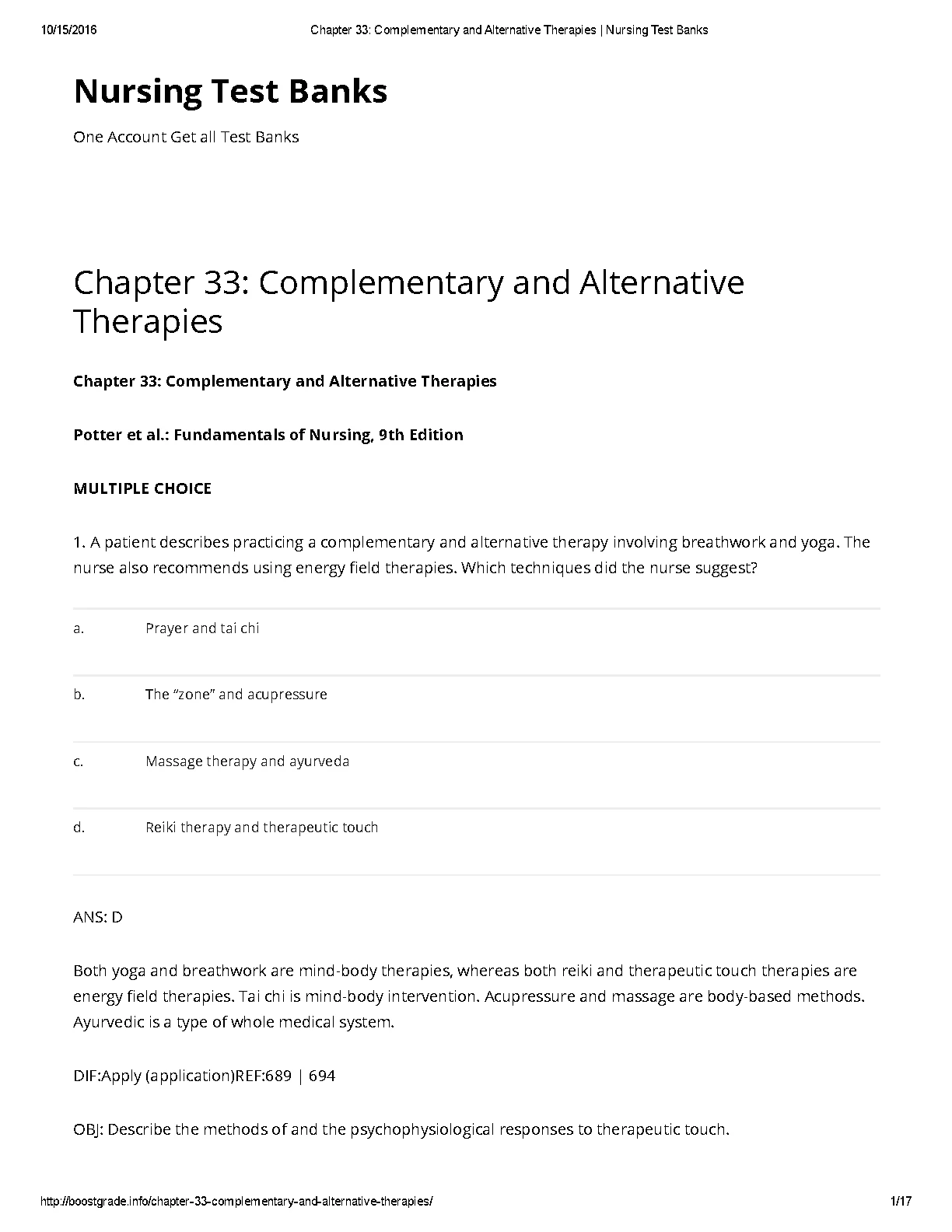 Test Bank For Fundamentals of Nursing, 9th Edition BY Potter et al.(Chapter 33: Complementary and Alternative Therapies)