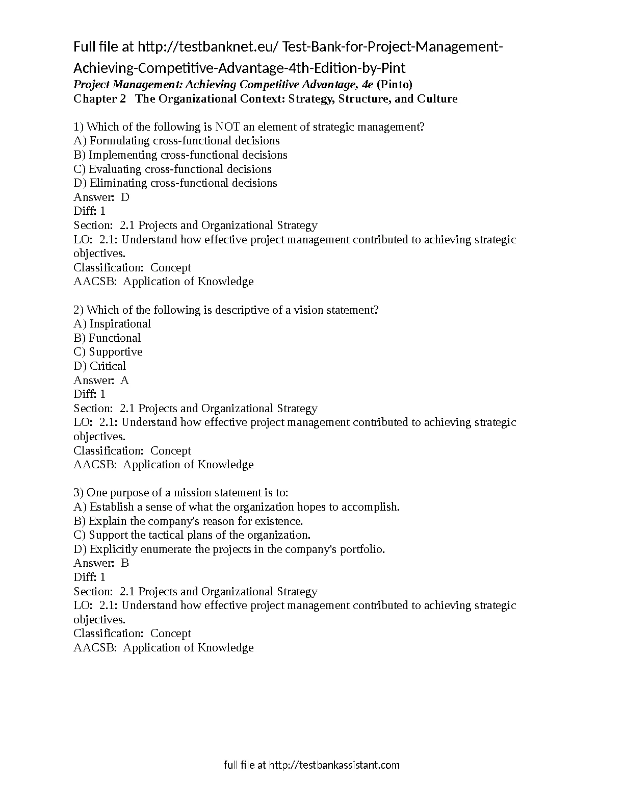 TEST BANK FOR Project Management: Achieving Competitive Advantage, 4th Edition BY Pinto. DOWNLOAD on www.hackedexams.com INSTANTLY.