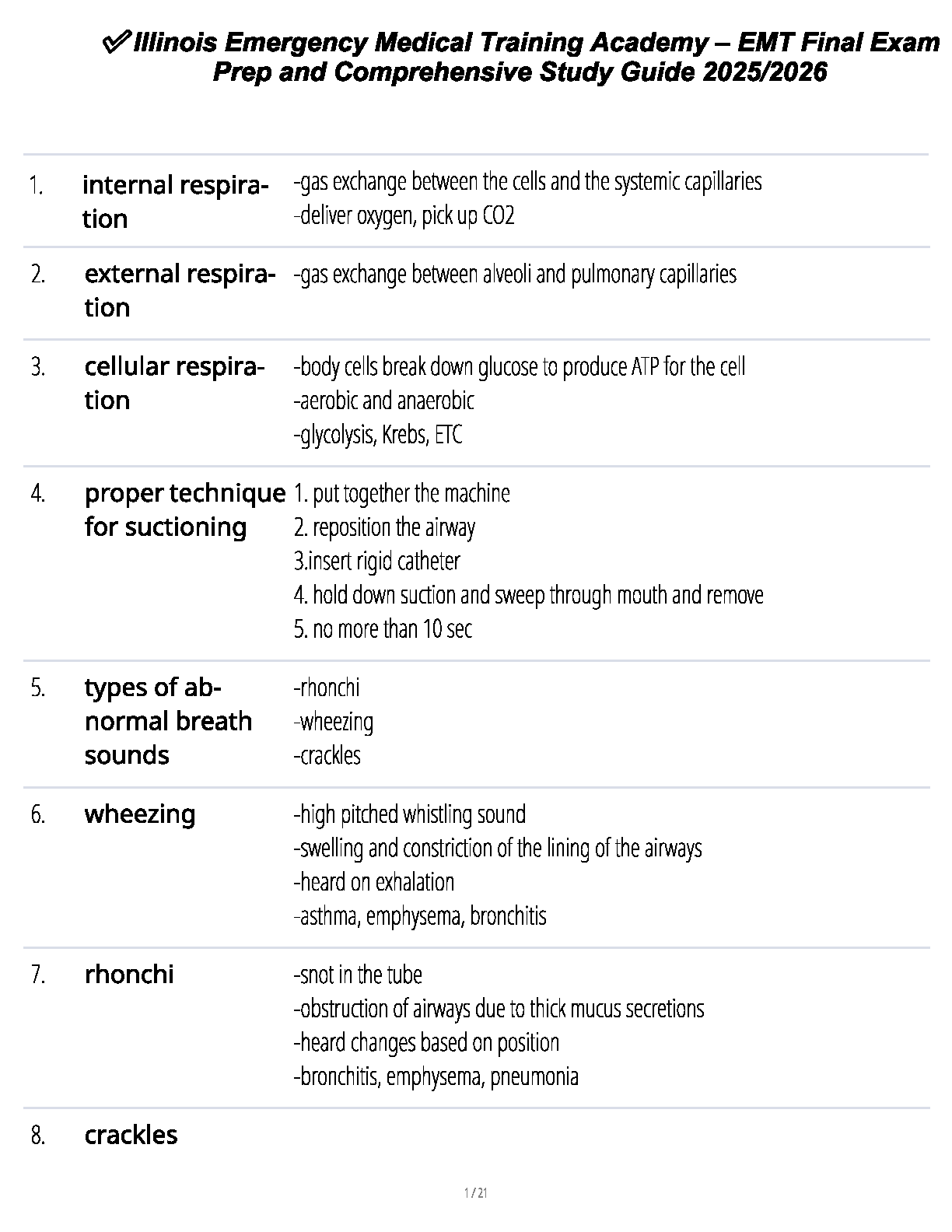 Master the essential knowledge for your EMT final exam with our newly updated 2025/2026 Comprehensive Study Guide. This guide is expertly designed to help you pass on your first try, eliminating the stress of resits. It provides detailed, easy-to-understand explanations of critical topics, including internal, external, and cellular respiration, proper suctioning techniques, and the identification of abnormal breath sounds like wheezing, rhonchi, and crackles. Ace your certification with this essential prep tool from the Illinois Emergency Medical Training Academy.