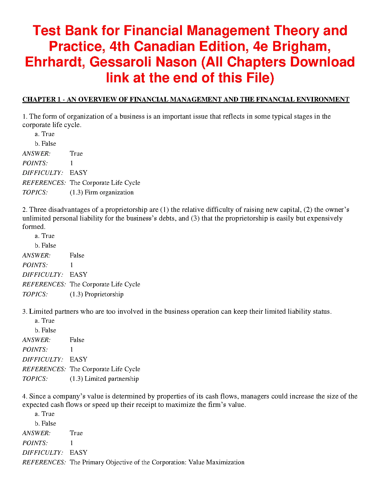 Test Bank for Financial Management Theory and Practice, 4th Canadian Edition, 4TH EDITION BY Brigham, Ehrhardt, Gessaroli Nason (All Chapters)