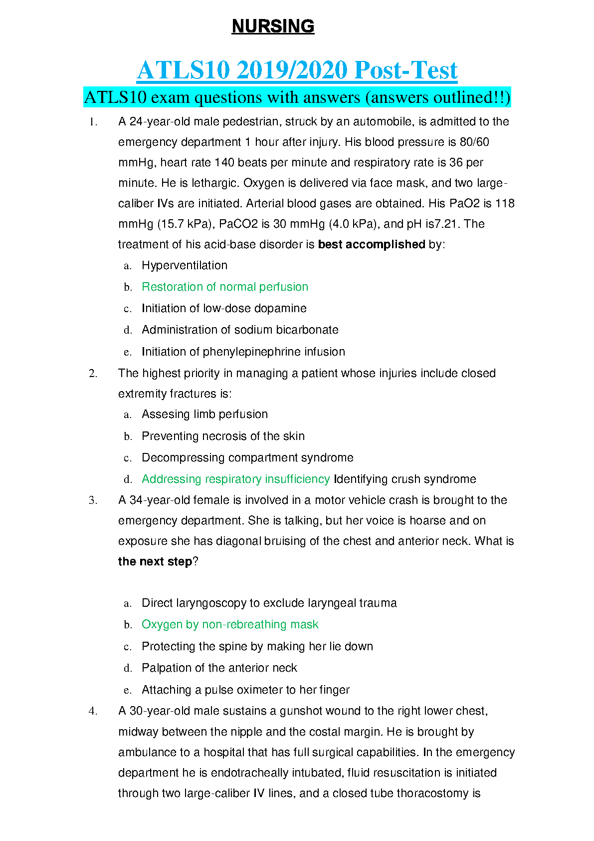 NURSING ATLS 10 Exam Questions with 100% Verified Answers