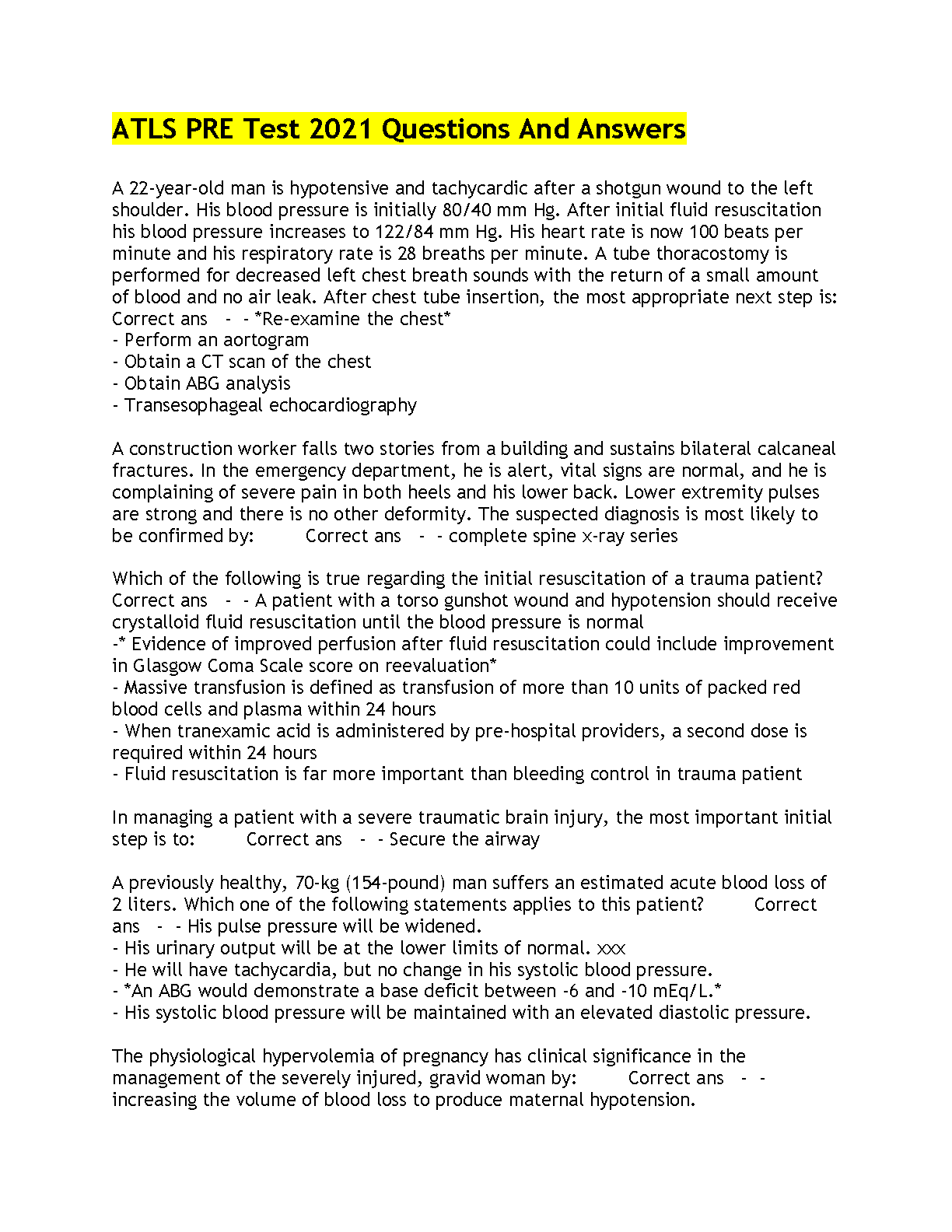 ATLS PRE Test Questions And Answers 2023. GRADED A+