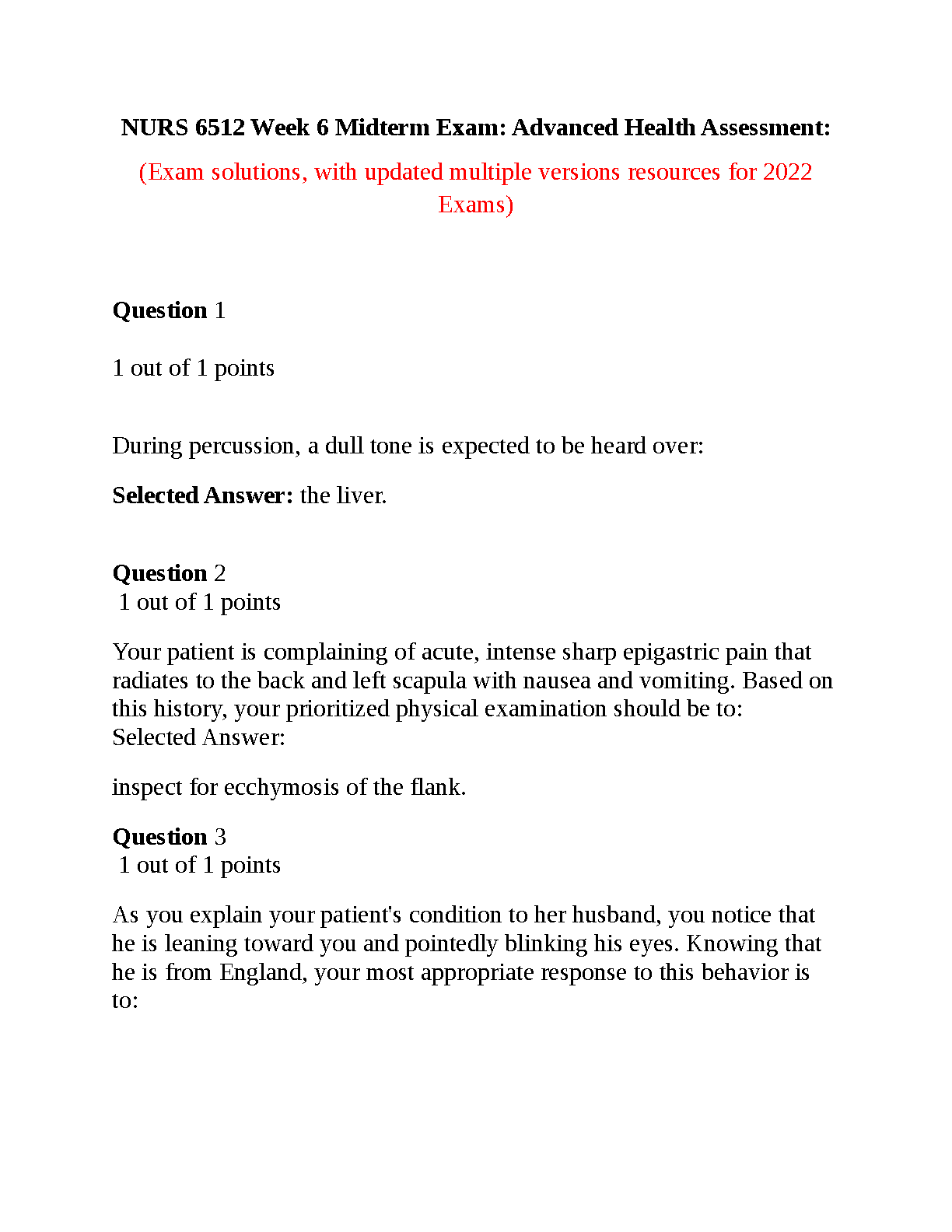 NURS 6512 Week 6 Midterm Exam: Advanced Health Assessment: (Exam solutions, with updated multiple versions resources for 2023 Exams)