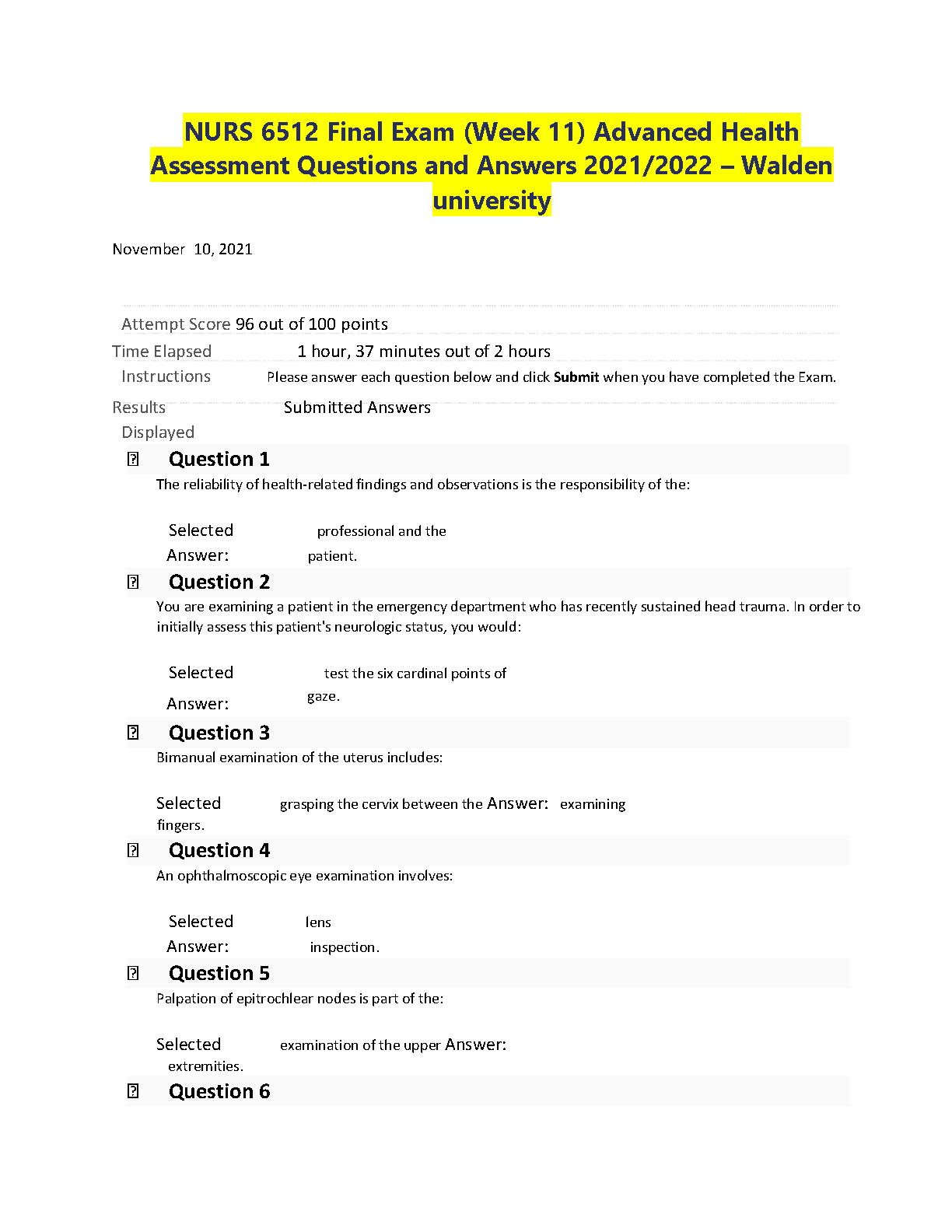 NURS 6512 Final Exam (Week 11) Advanced Health Assessment Questions and Answers (Walden university) 2022/2023. DOWNLOAD on www.hackedexams.com INSTANTLY.