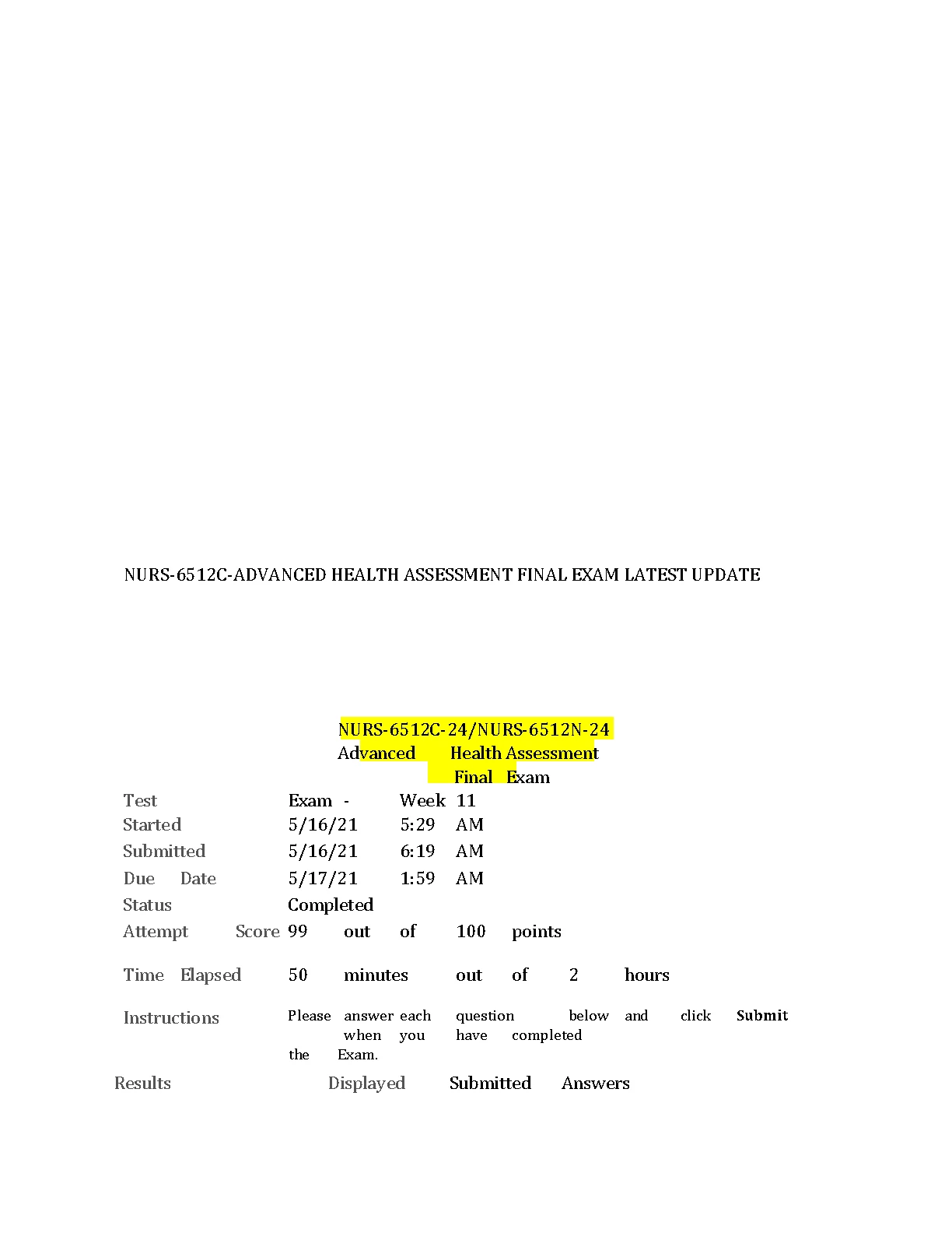 NURS 6512C ADVANCED HEALTH ASSESSMENT FINAL EXAM LATEST UPDATE 2023/2024