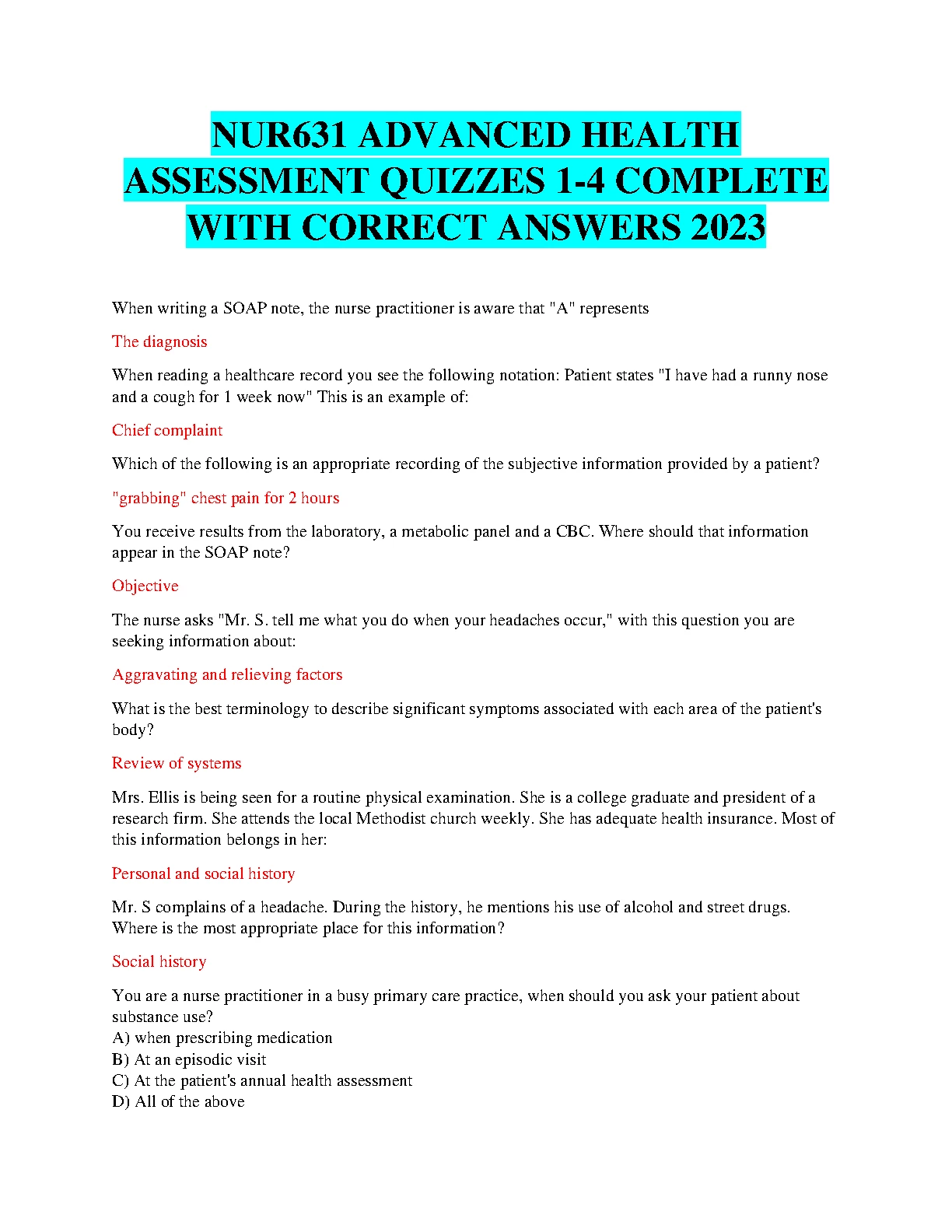 NUR631 ADVANCED HEALTH ASSESSMENT QUIZZES 1 TO 4 COMPLETE WITH CORRECT ANSWERS 2023