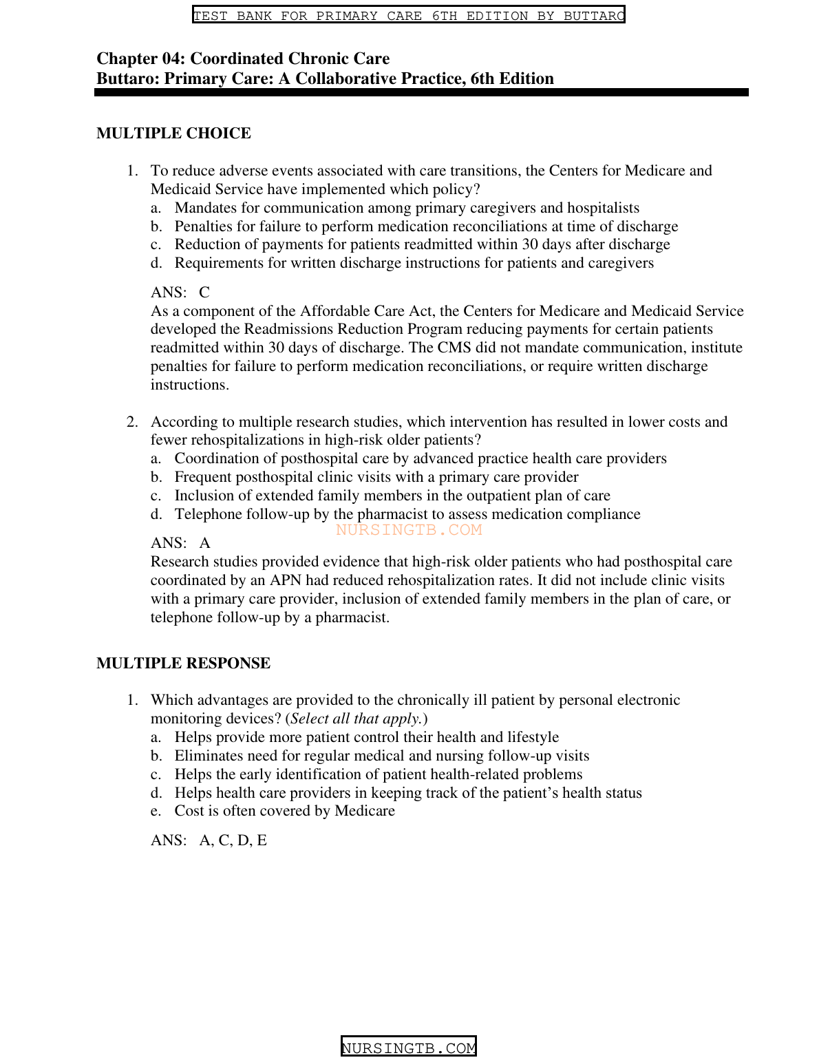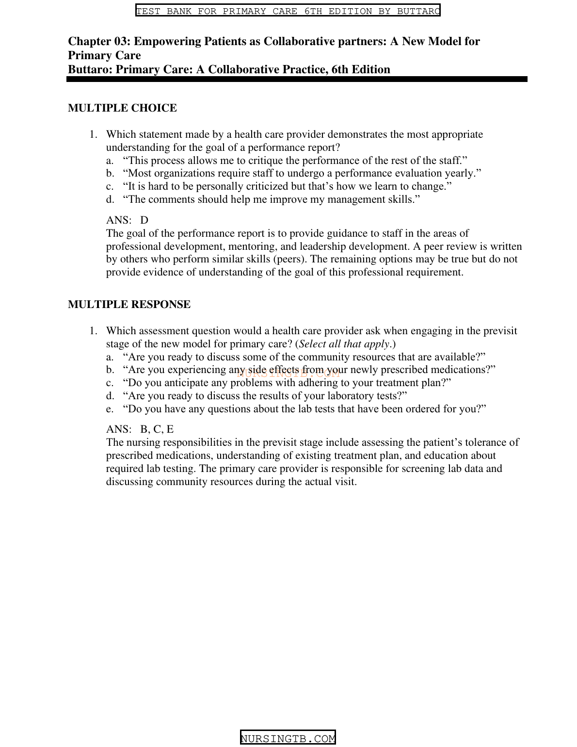 TEST BANK FOR PRIMARY CARE -A COLLABORATIVE PRACTICE,6TH EDITION BY BUTTARO UPDATED 2023