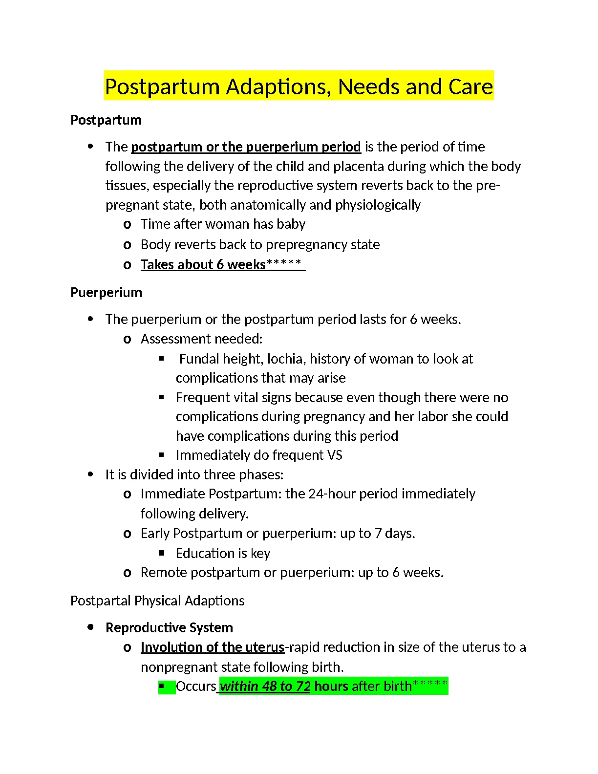 TEST BANK FOR FINAL EXAM OB 101 (Postpartum Adaptions, Needs and Care)