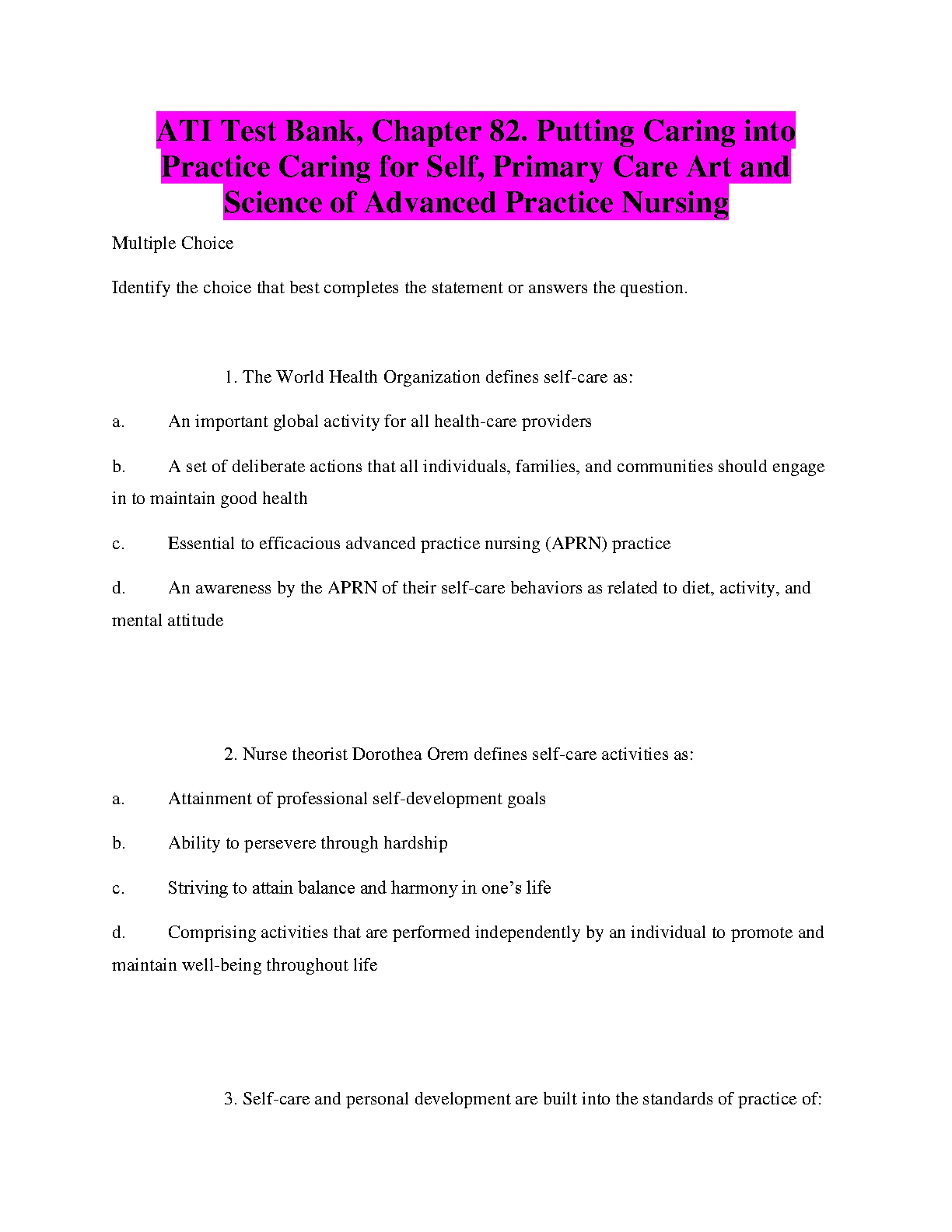 TEST BANK FOR ATI, Chapter 82. Putting Caring into Practice Caring for Self, Primary Care Art and Science of Advanced Practice Nursing
