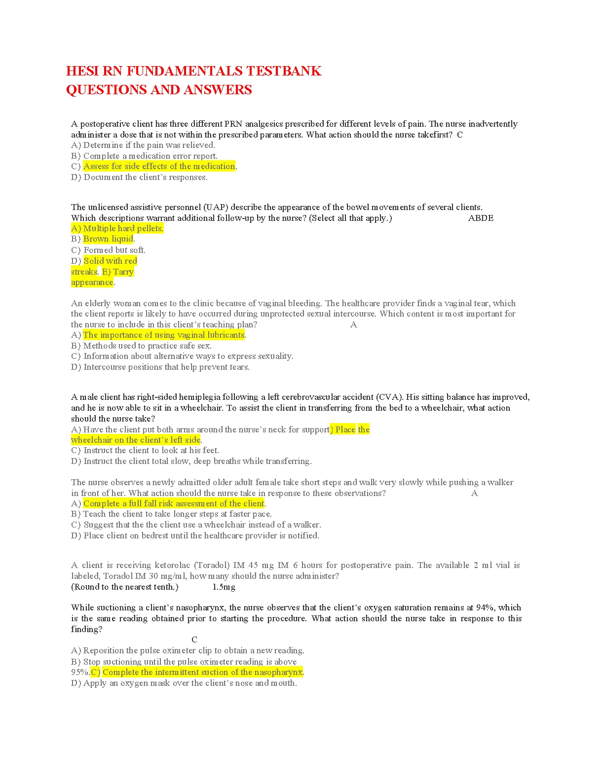 TEST BANK FOR HESI RN FUNDAMENTALS QUESTIONS AND ANSWERS. GRADED A+