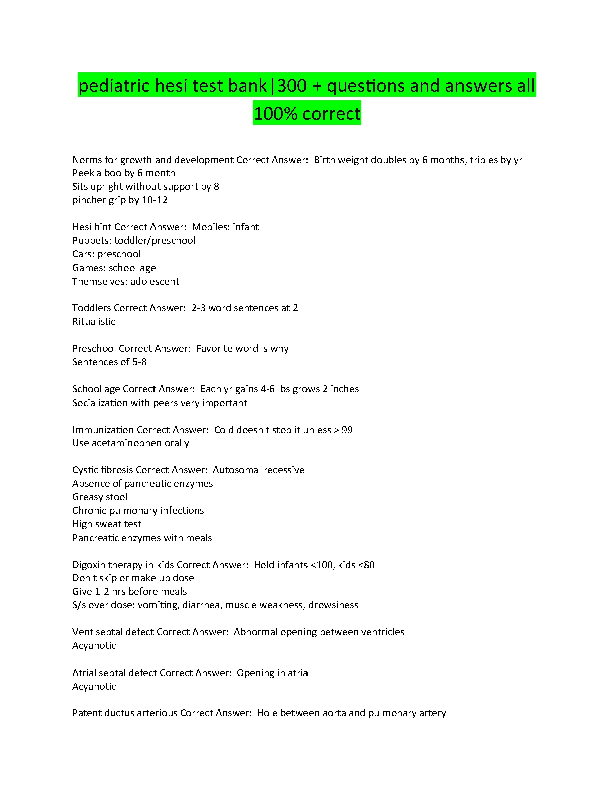 TEST BANK FOR HESI Pediatric Questions and Answers. GRADED A+